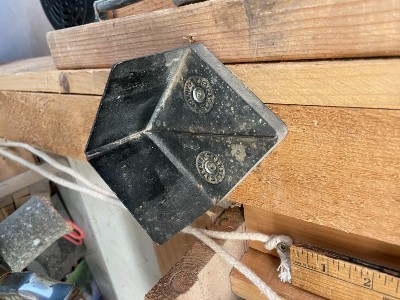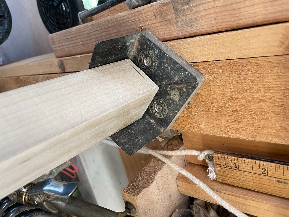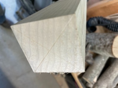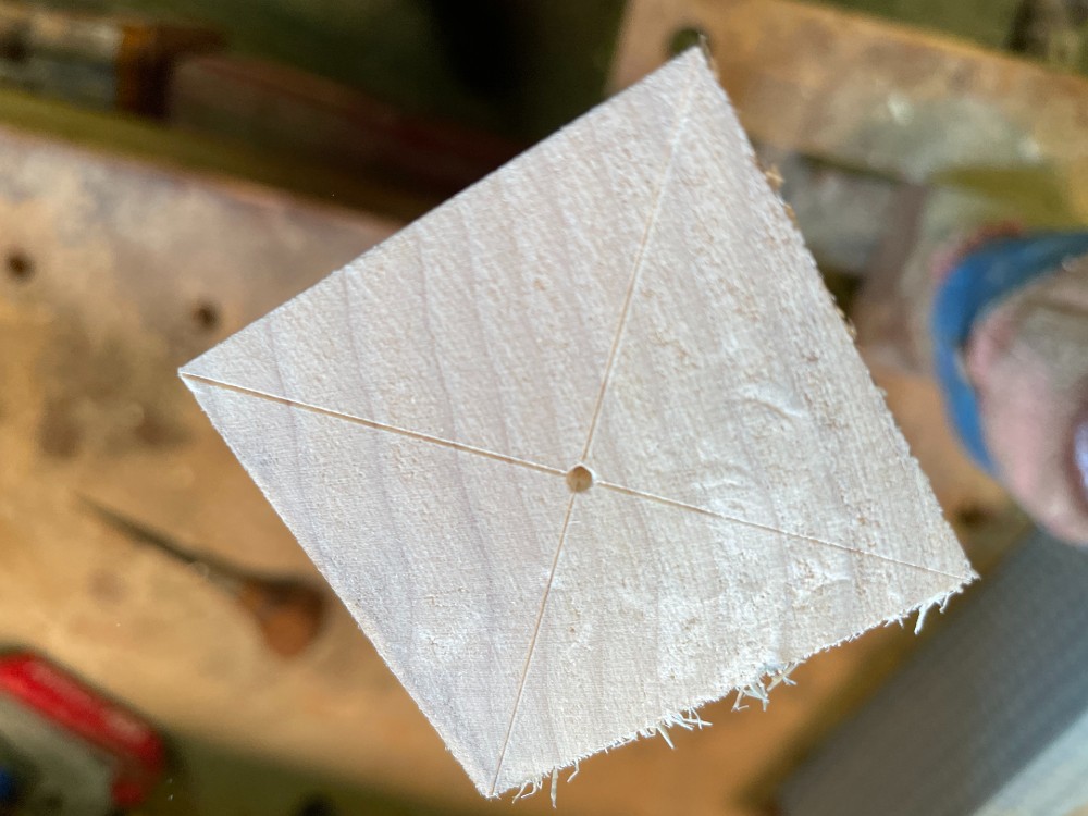 With the blank firmly seated in the 90 degree cup, I can whack the end with a wooden mallet to mark the diagonal, turn the blank 90˚ and whack it again to mark the second diagonal.