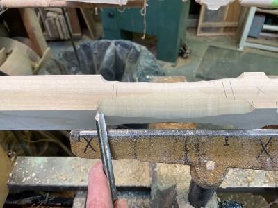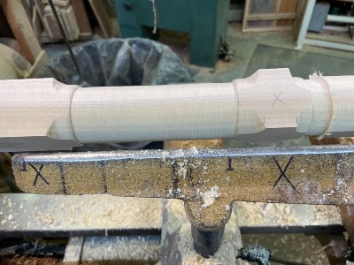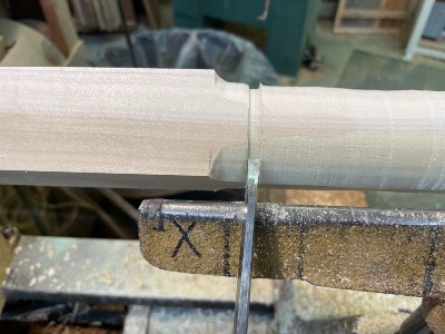Note the "X" pencil mark to remind me visually to protect that section. It also helped remind me that the 2" square is not centered between the two transition details but is rather nearly 1/8" higher on the post (also visible are the story-stick pencil marks). While somewhat disconcerting to the turner's sense of symmetry, a design detail like this often makes the overall "look" even more pleasing.