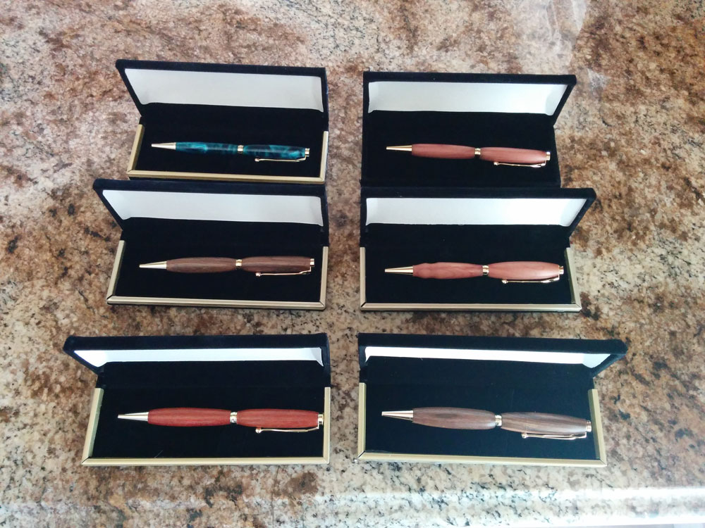I have now made some 15 pens based on Rob's video. Below are some pens made of cedar and walnut (both Missouri woods from downed trees on a relative's dairy farm), oak, and my first "acrylic" pen.