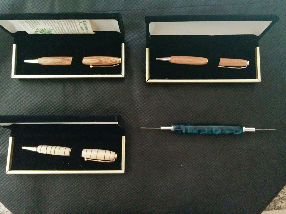 In the photo below, the upper left hand corner pen is olive wood. Upper right hand corner is Walnut. Bottom left hand corner is a wood I salvaged from some old wood projects, I don't know what kind it is, I just burned it with some wire. Bottom right hand corner is my wife's seam ripper, which I made out of acrylic.