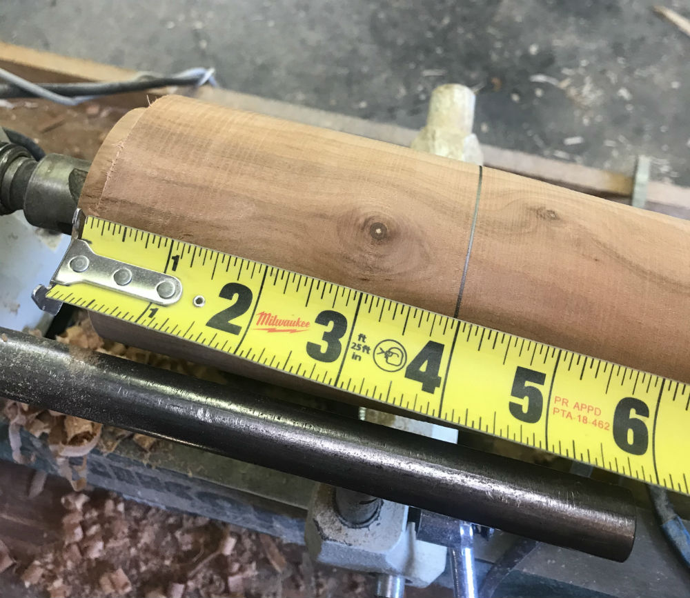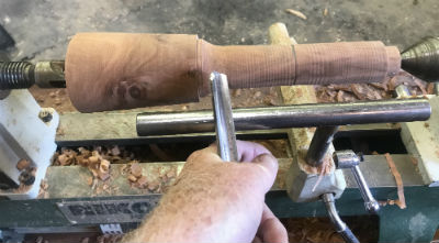 Using that mark, with the calipers set at slightly larger than the 2" diameter, and the beading & parting tool, establish the smaller end of the head that will eventually be a small shoulder leading to the cove into the handle.