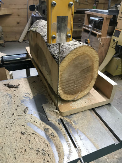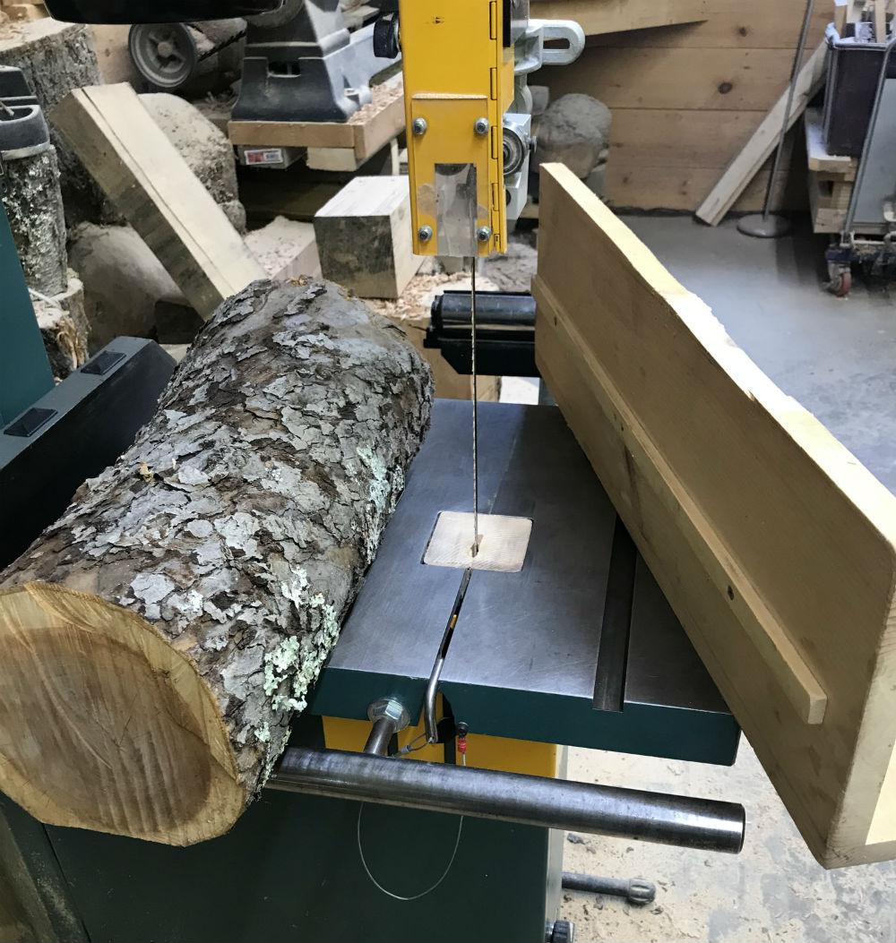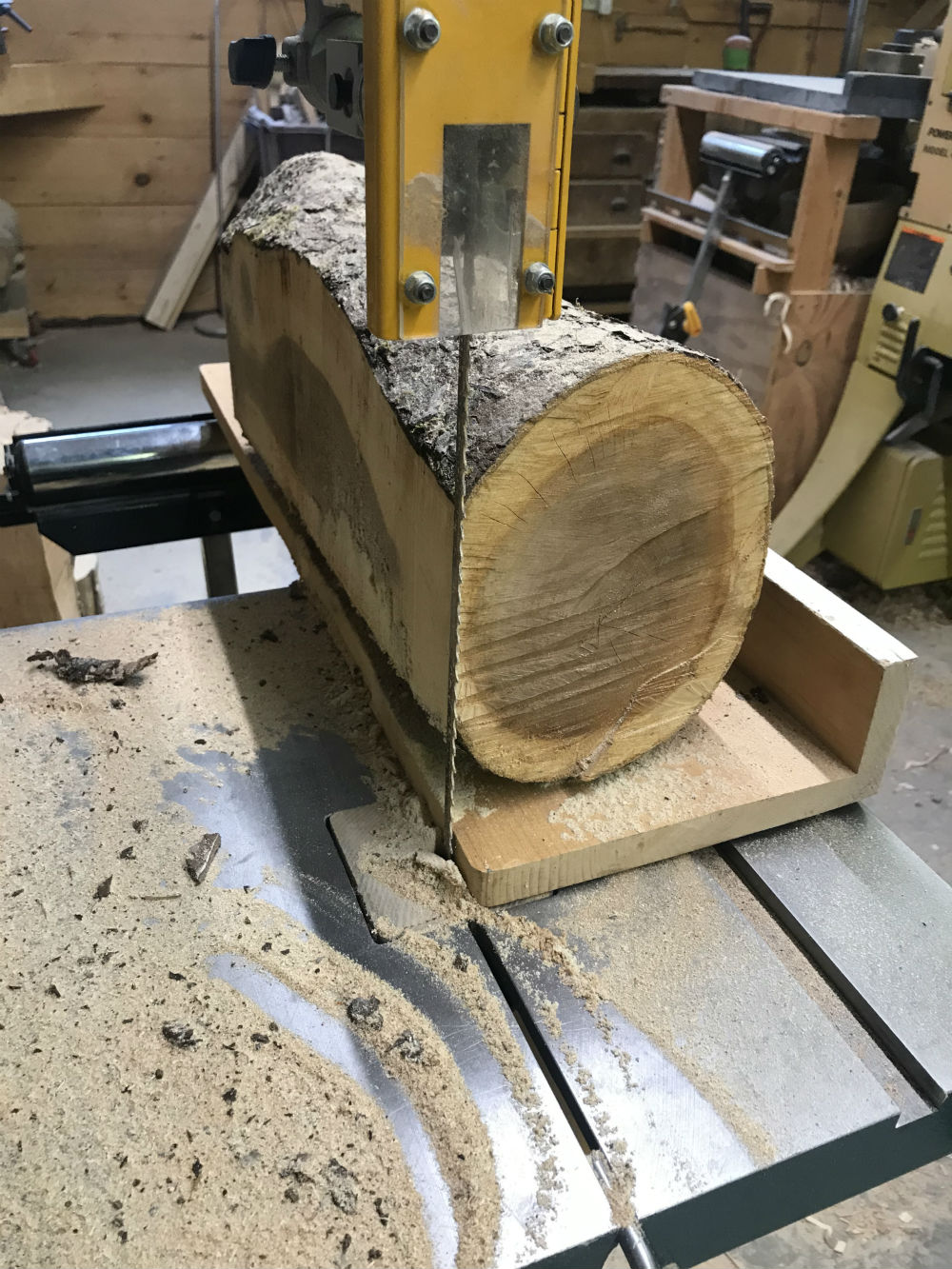 Safe management of a round log at the bandsaw is critical, and building a sled from scraps is well worth the little time required.