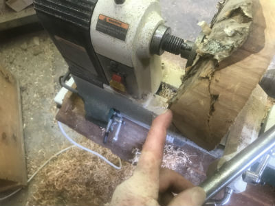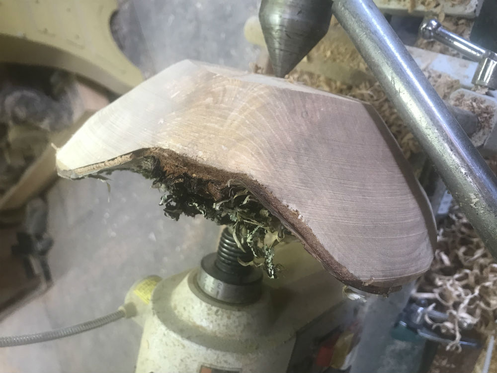 bowl blank is mounted by positioning the largest circle (the sawed face that will become the bowls top opening) facing the headstock and supporting the bark-covered, outer edge of that log with a live-center in the tailstock (this will be the bottom of the bowl).