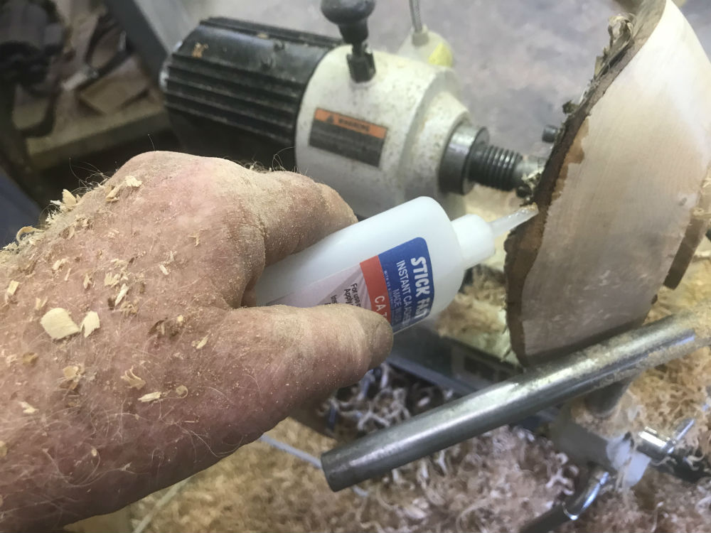 Once the glue is dry, sand carefully to avoid knocking off the bark, especially to avoid the irregular spinning edges knocking into the turner's hands. A fairly strong, incandescent light accentuates the shadows and can help the turner see the outside edges.