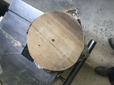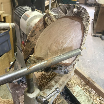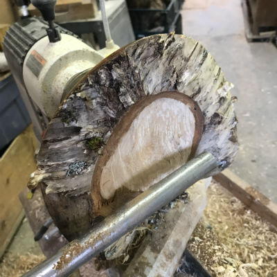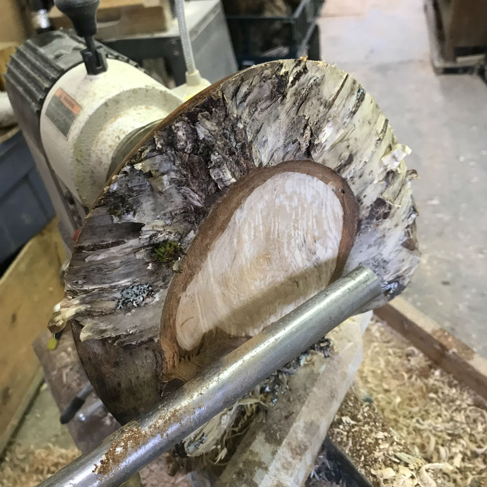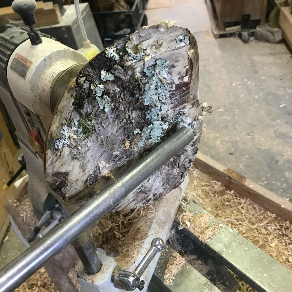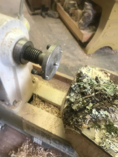 reverses that position and presents the bark encrusted side to the headstock; the large sawn side to the tailstock. Because the bark-covered outer edge of the log is uneven and the bark unsecure, mounting it on the headstock requires some careful thought to ensure the safety of the turner and, of course, of the blank of wood. There are several different jigs and methods to accomplish this.