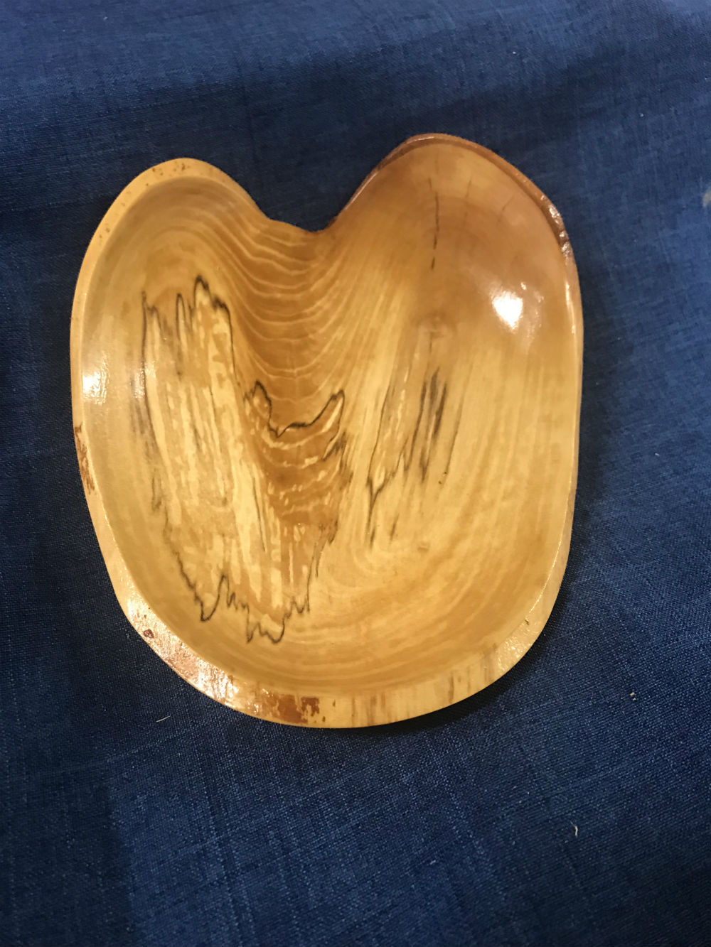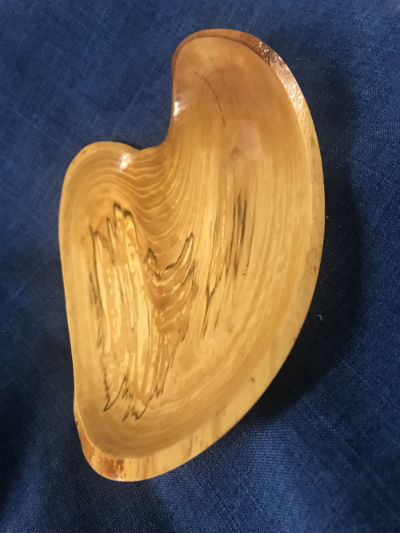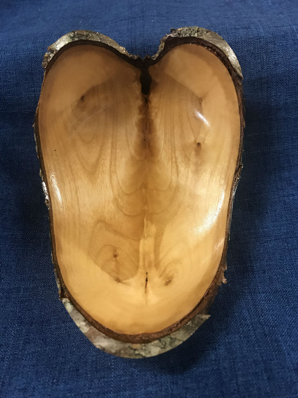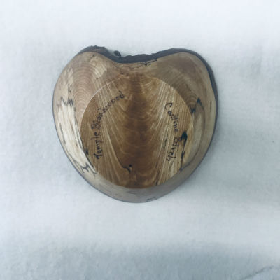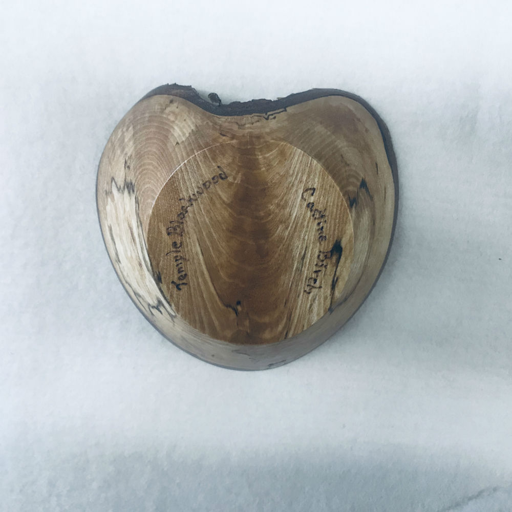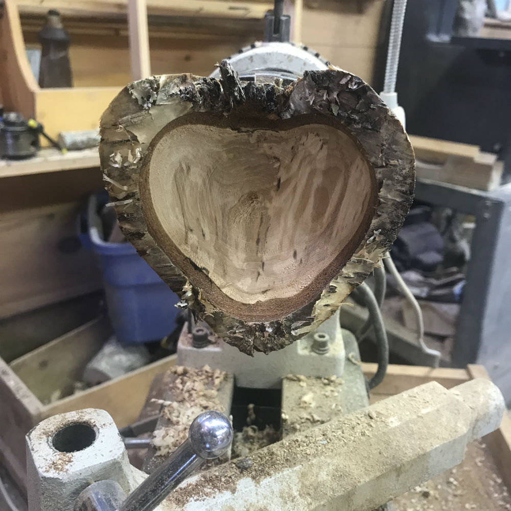 The heart shape, outlined in natural edge bark, enhanced by the deep and complex graining of the crotch limb of a birch from the woods, finished with naturally clear friction polish and wax addresses that search. The search for just the right piece of wood is ever-present for a project like this.