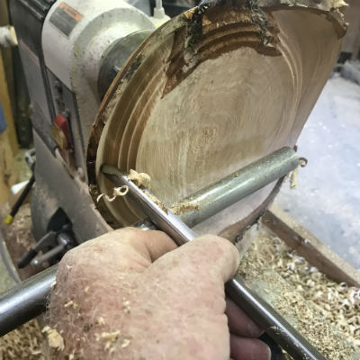 With the blank firmly captured between the headstock and tailstock, turning the outside shape can be quickly accomplished using a bowl gouge and the common "pulling cut" with the bevel rubbing.
