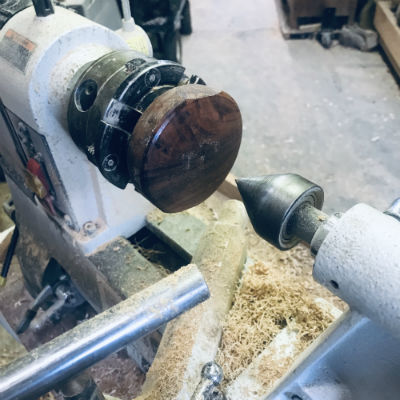 The final step, turning off the tenon and finishing the bottom, requires a "jam chuck" which simply means to press the piece between the two centers firmly. There are a number of ways to do this, but the easiest is to turn (and keep) a plug for the chuck and mount it.