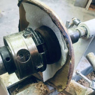 Adding a soft cushion, in this case a folded paper towel, avoids having the inside of the carefully sanded and possibly friction polished piece being marked if the piece slips as the tenon is turned away.