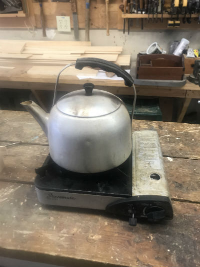 An old tea kettle and a steady heat source, like this propane camp stove to keep the water boiling is about as simple a set-up as possible and avoids creating a "kitchen conflict" elsewhere in the home.