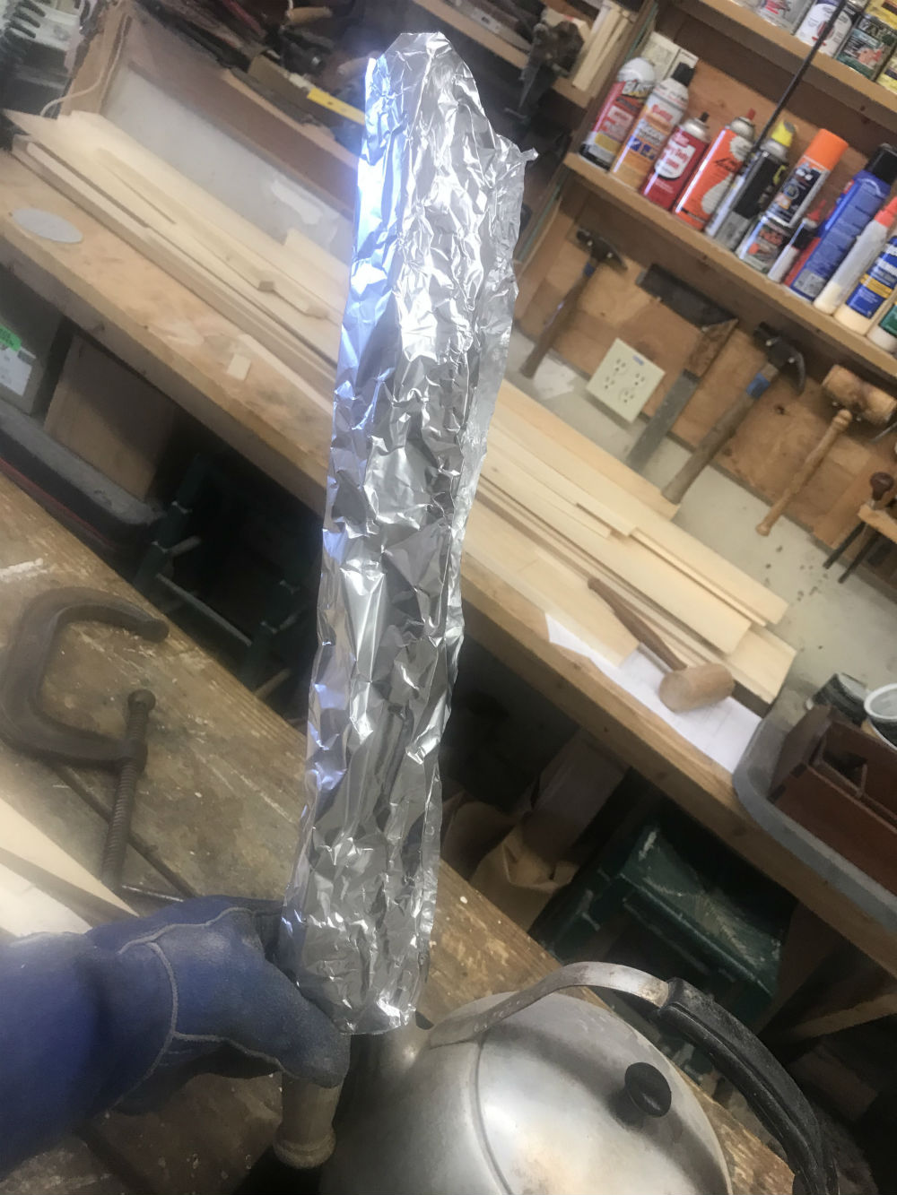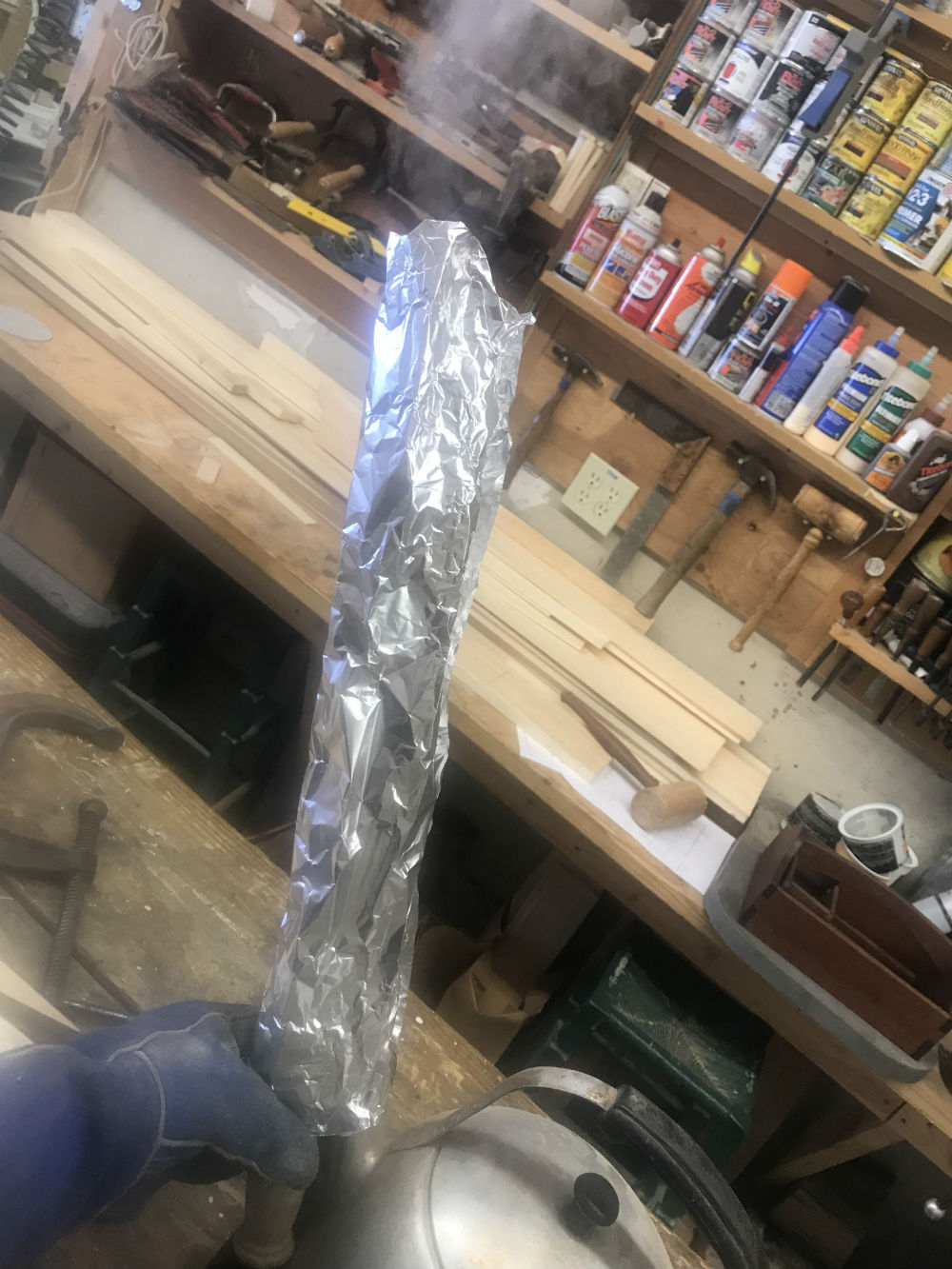 the kettle spout aimed into the bottom of the tin foil, and leaving a small opening in the