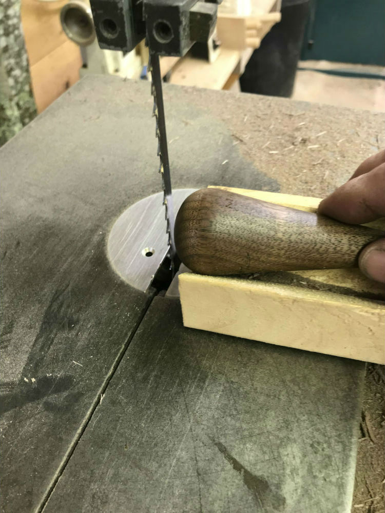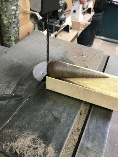 After removing the fid from the lathe, use a "vee" block to carefully saw off the upper and lower waste blocks leaving the tenons proud (protruding). The vee block is especially helpful when turning a round object using a bandsaw because it keeps the turner’s hands away from the blade and stabilizes the work while cutting.