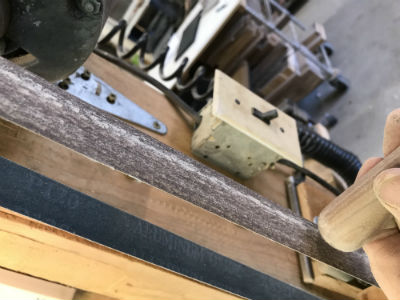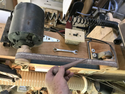 This shop-made sanding arrangement uses a typical 120 grit 1" X 42" belt mounted between two hand-turned pulleys. With the pulleys slightly crowned (larger in the middle than on the ends), the tightened belt will track smoothly.
