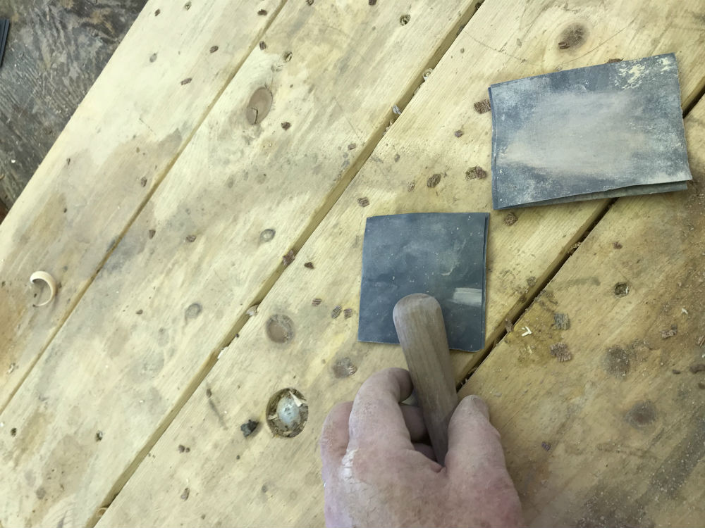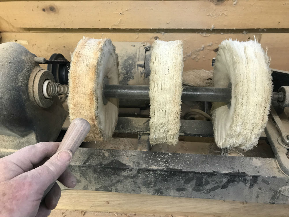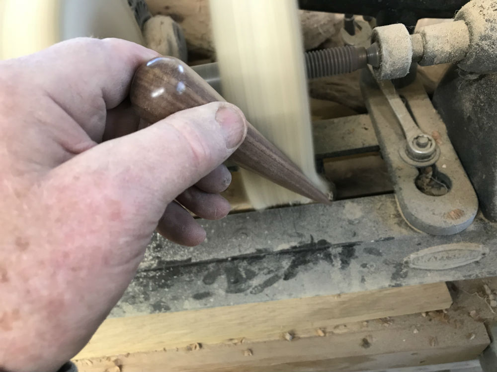 With the remainder of the waste-tenon removed, a light touch on the flexible belt followed by hand sanding brings the rounded palm-grip nearly to finish.
