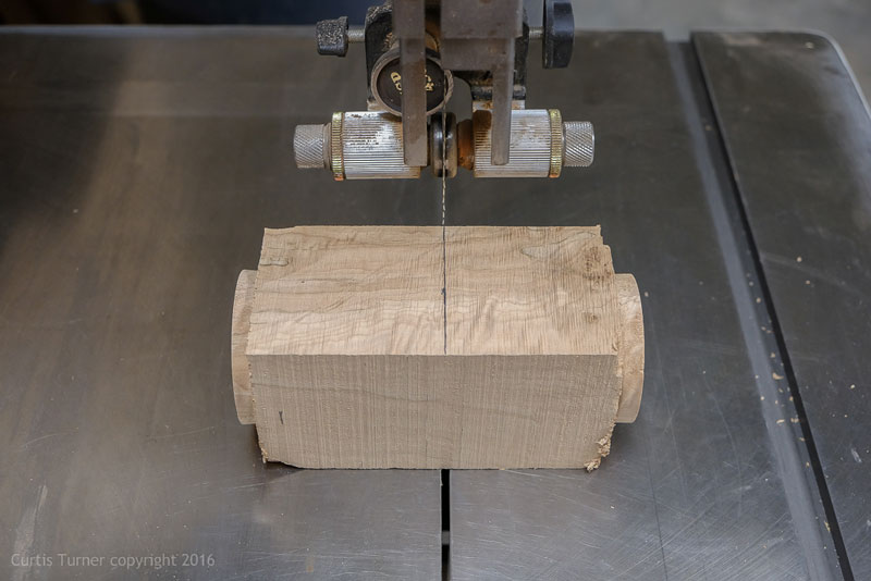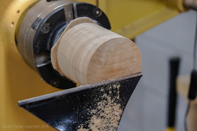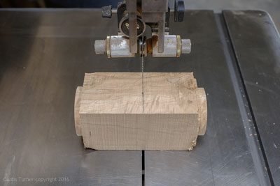 I used a quilted maple blank for this turning only because it was almost the perfect size. This blank was 2-1/2" x 7". I would have preferred something just slightly longer. This meant I needed to be very cautious with the blank; there was almost no wood to waste. I knew I would need to separate the blank to turn the lid, however, I wanted to remove as little wood as possible. My solution was to mount it between centers but only turn down each end. This allowed me to remove the blank and cut it to size on the bandsaw.