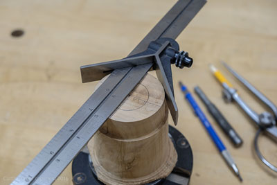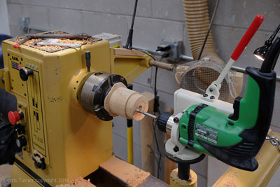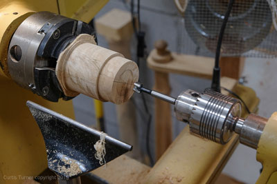Next, the base was mounted in a chuck. Then it was turned to my desired size. I also sized the tenon and faced off the end grain.