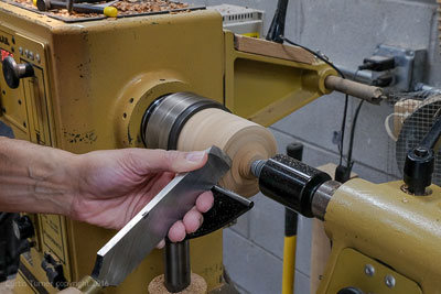 A set of dividers was used to layout the proper diameter for the tenon on the base. Then I used a large drill bit to initially hollow out the lid. A large scraper was used to hollow the remainder of the lid.