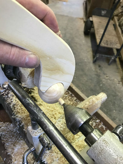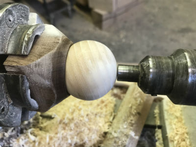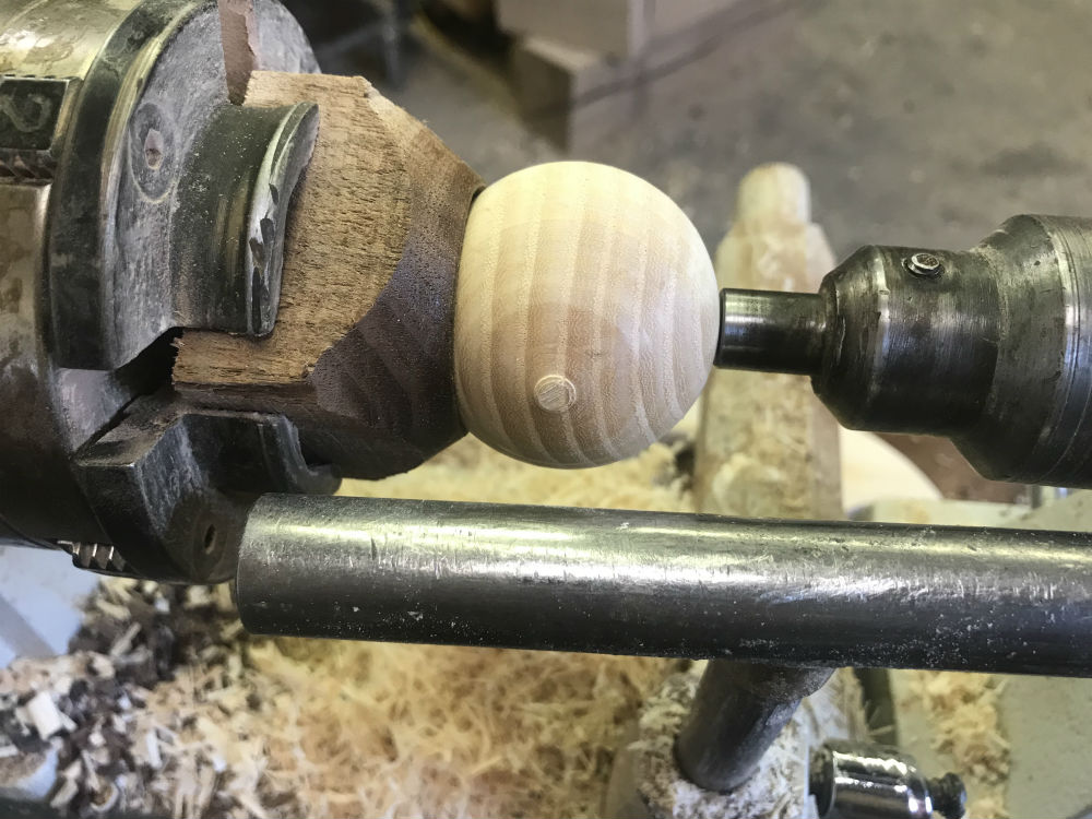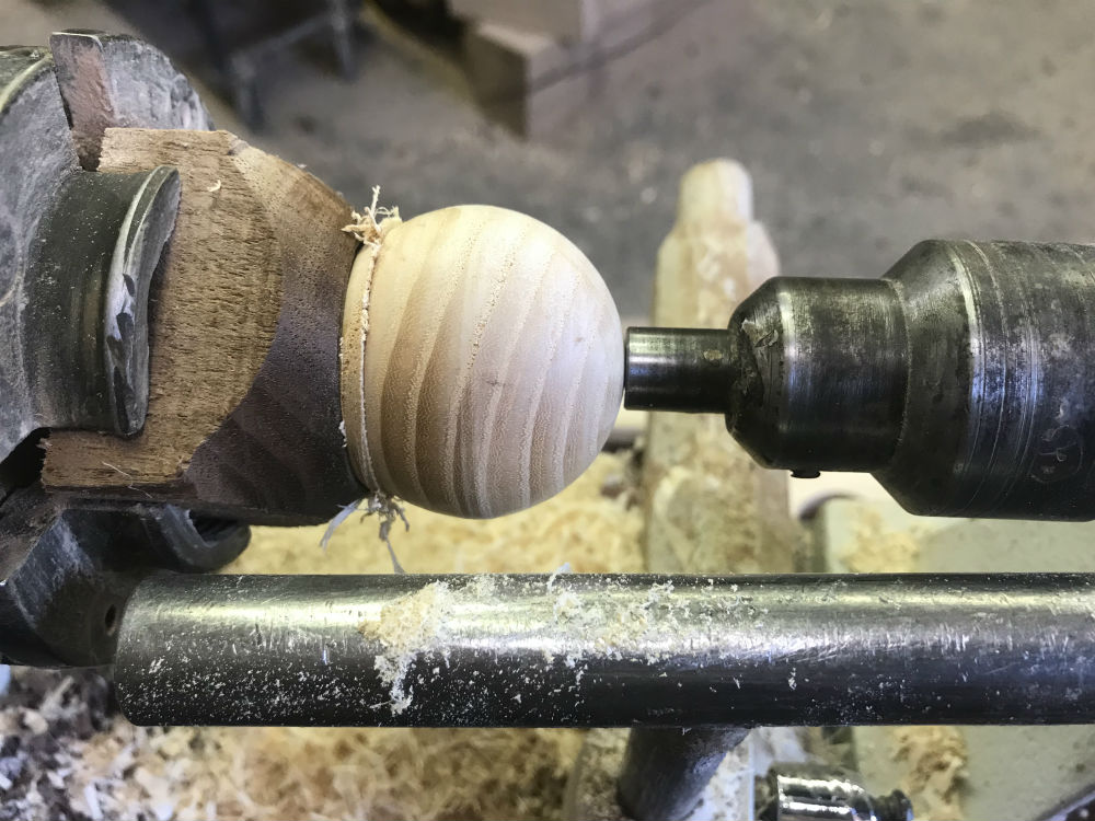 Once complete, saw off the wasteblocks close but without marking the sphere. Turn a cup-chuck jig and add a blunt live-center to the tailstock to finish rounding the sphere.