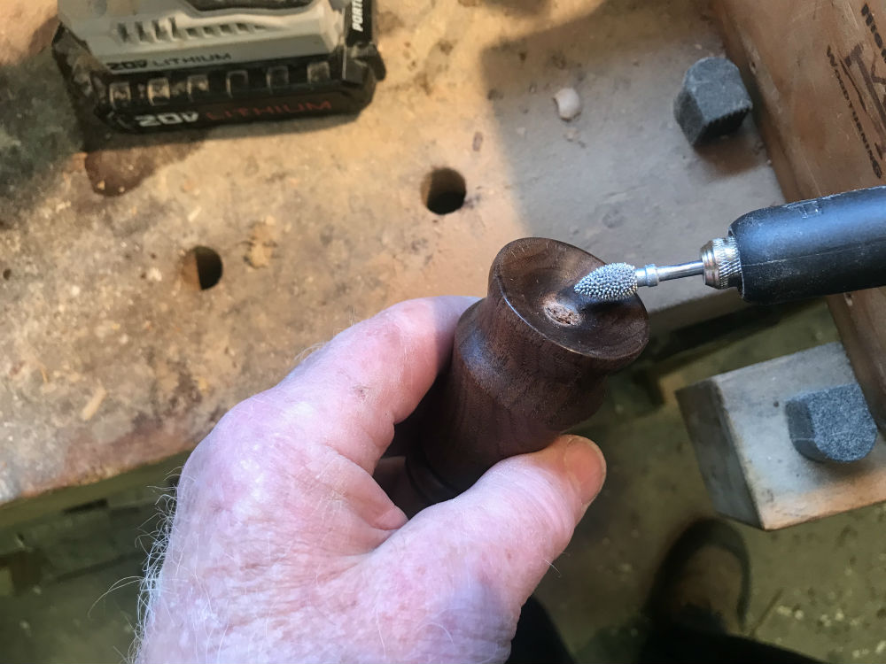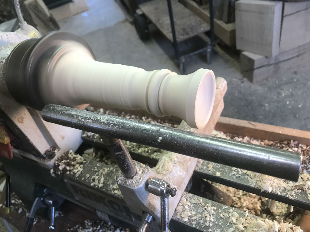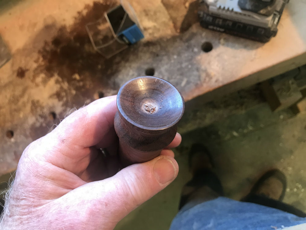 Once off the lathe, remove the live center wasteblock in the emerging cup, and finish shaping.