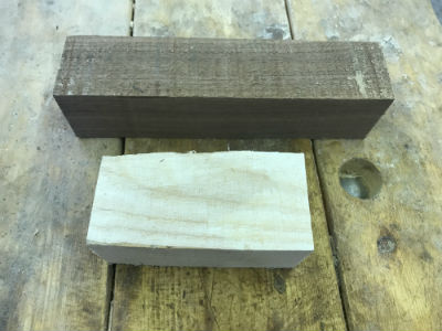 Begin with two blanks for turning. I prefer selecting wood of contrasting color and with figure rather than painting. My goal is for the toy to be innately attractive as naturally finished wood can be, and I am "color-stupid" and unskilled when it comes to painting. The blank for the 2" ball should be 2-1/4" X 2-1/4" X 5" and the blank for the handle or post should be 2" X 2" X 8".