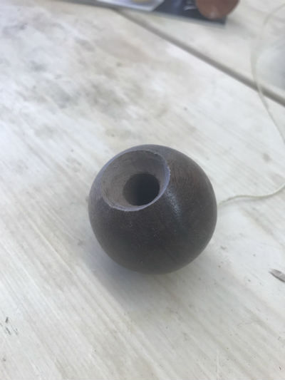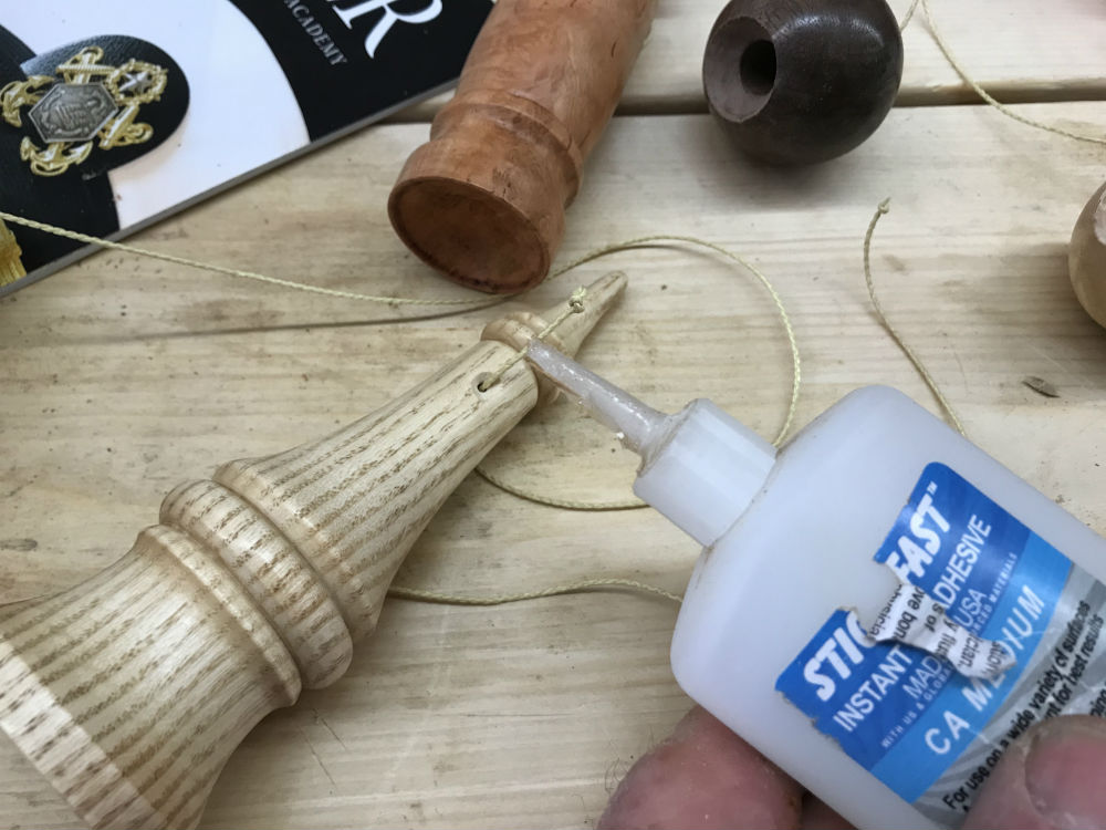 After threading the string through the sphere, knot one end (sailor's figure 8 or similar) and pull it tight. A drop of medium CA glue down the inner shaft will hold it in place at the bottom of the 5/8" drilled hole inside the sphere.
