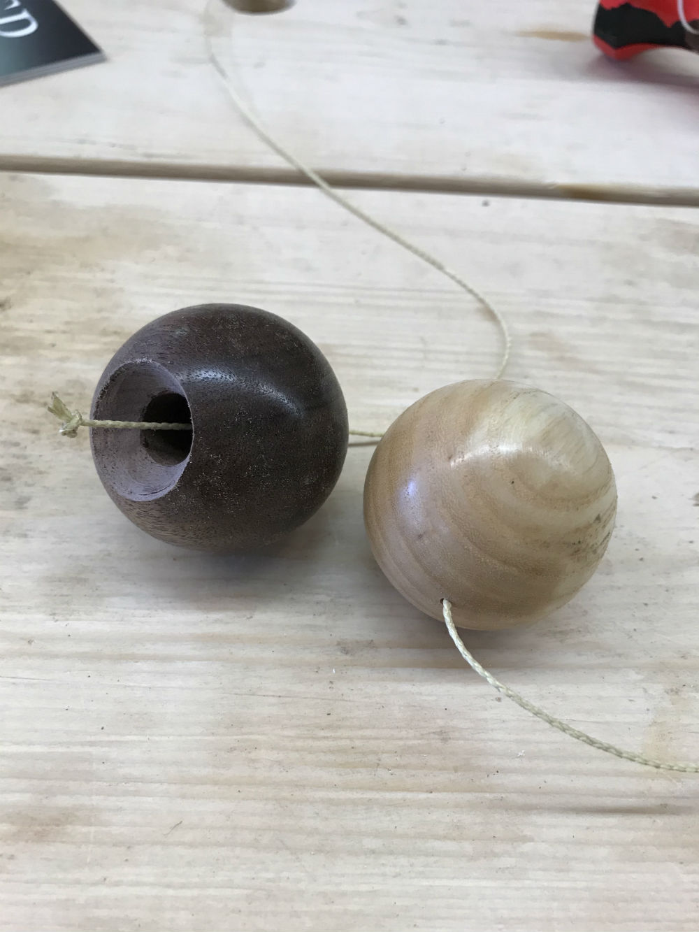 There are many marketing jigs and a variety of methods to turn the sphere (ball) for this toy. The least complicated, quickest, and most fun is to turn it free hand. This is a terrific skill-builder, takes practice, and is generally more fun and more satisfying for an avid turner than playing with the completed toy. Taking an afternoon to turn a series of different spheres of the same size or of progressively different sizes can be an enjoyable and productive exercise. The surprising thing is to learn – hand and eye – how little wood needs to be removed from a square block to create the round, balanced sphere.