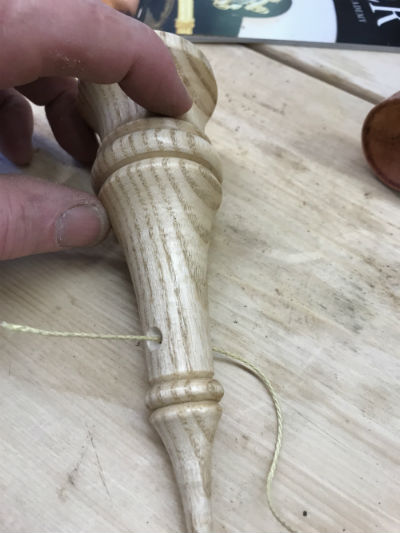 Using a countersink bit, mark a spot about two-thirds down the handle. Then use the smallest bit (string diameter) to drill through. Thread the string through.