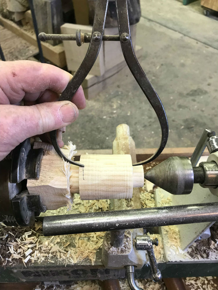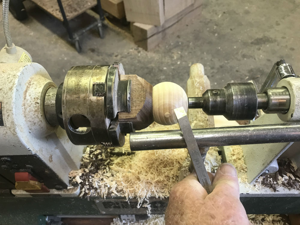Avoid reducing the diameter as you shape the sphere with a skew or small gouge and reduce the wasteblocks to a minimal diameter (courage and practice make this an excellent exercise). It can help your eye and judgement to make a try-gauge using a 2" drill bit to help you sustain the roundness of the sphere as you shape the blank.