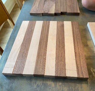 boards. I then ripped the 4 boards on my table saw to a width of 2" giving me four 2" by 18" pieces of walnut and four 2" by 18" pieces of maple.