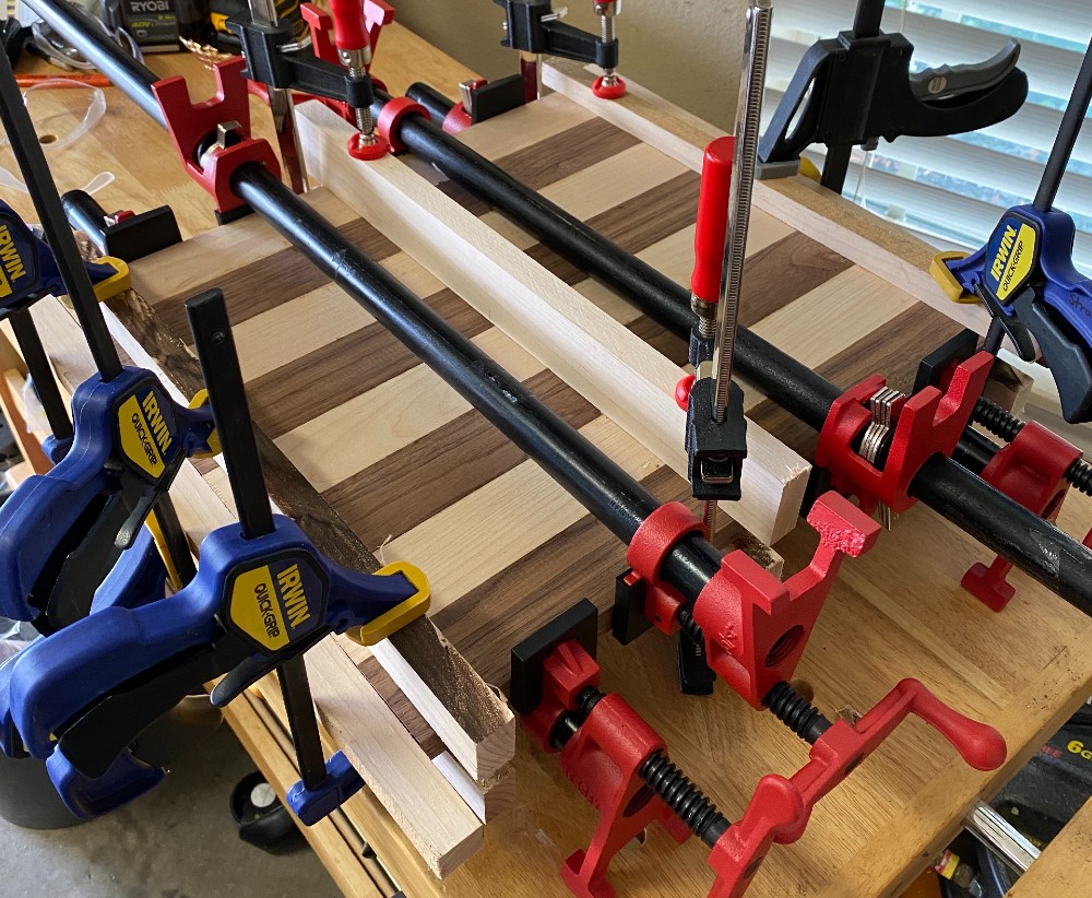 Next comes the fun part: glue up. I used 4 pipe clamps to compress across the joints and a number of