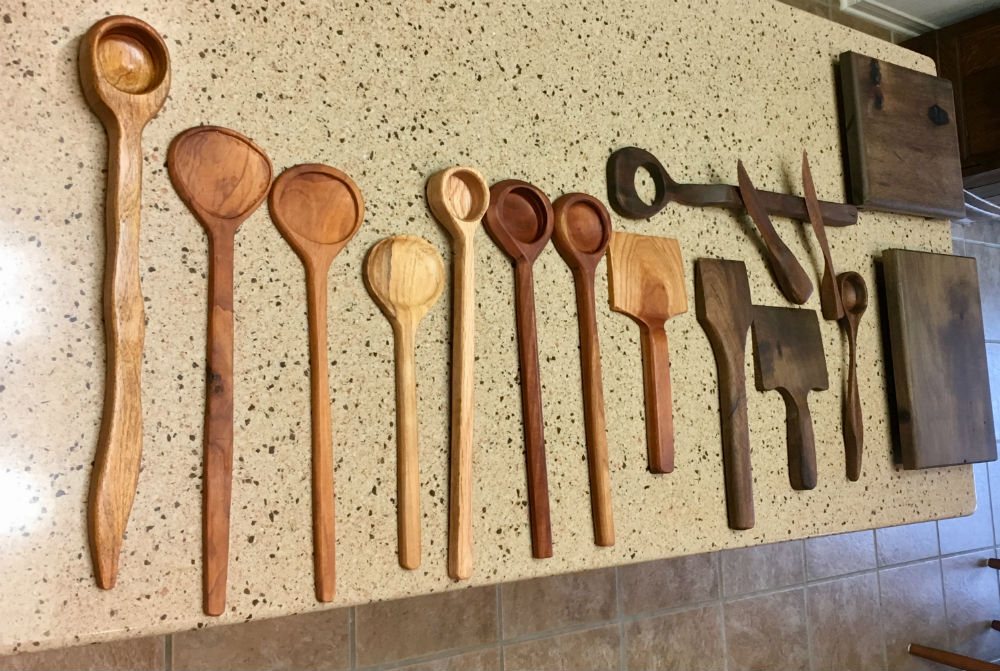 I've been woodworking for 20 years as a hobby. I had some scraps and started making hand made kitchen utensils, which you can see above and throughout this column. In the picture above from left to right the types of wood are, mesquite, pecan, oak, cherry, and mahogany. The two cheese servers and butter knifes are mahogany.