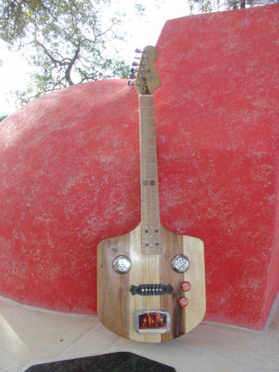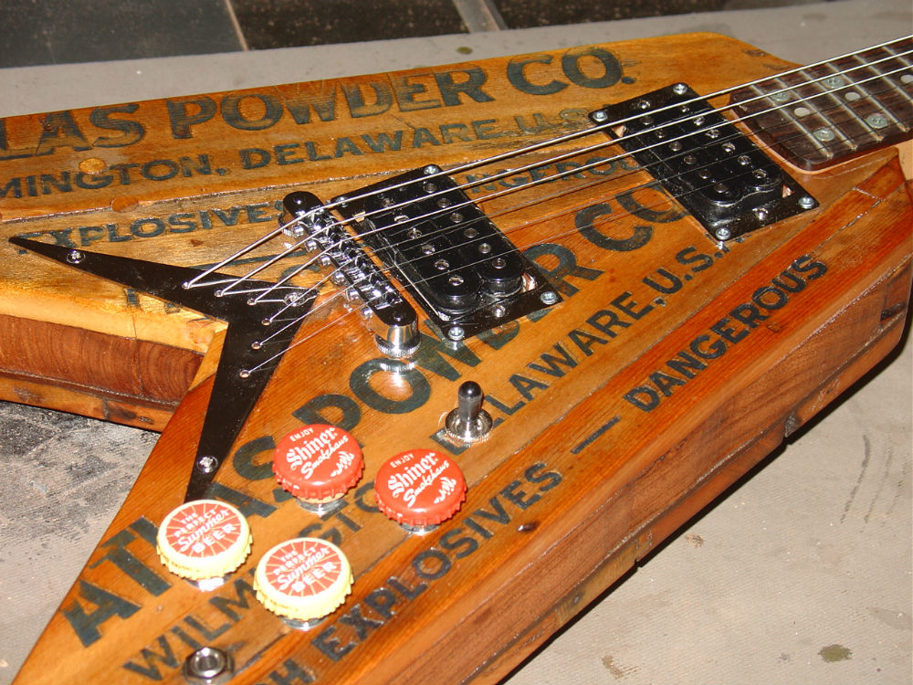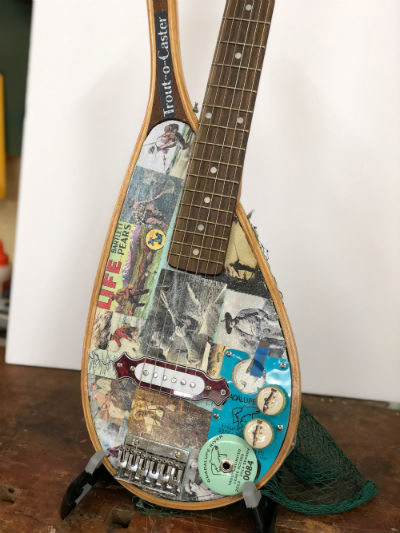 For the "box" guitars, I've used a fishing net, a pizza peel, an album cover, a cookie tin and much more as the basis for the guitar. For the fancier guitars, I typically use nice wood, and they also have a theme depending on the non-profit (cancer ribbon for a cancer charity, river for a naturalist event, etc).