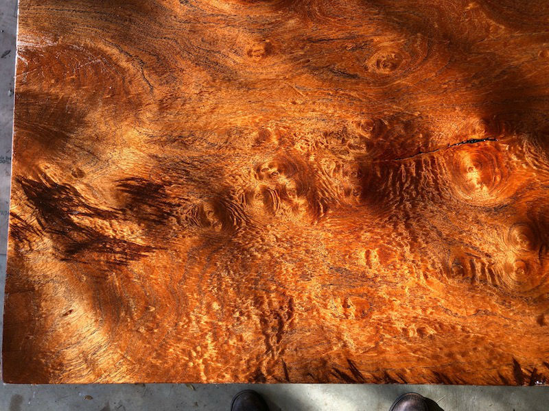One of the slabs (28” x 9.5') had the most interesting combination of figures I've seen on one board… quilt, flame, eye burl (as I think it's called) and many other “flaws”. It also had some marks left by a planer or other tool, which I left, as it looked like tall grass in a field...