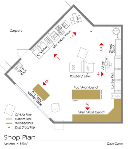 My shop's 543 sf area is roughly the equivalent of a typical double garage. The unusual plan