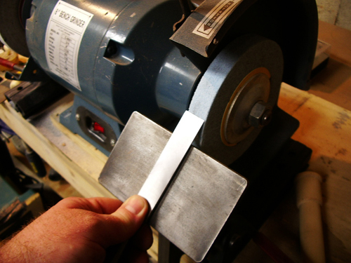 with a 60 grit aluminum-oxide wheel. The wheel pictured happens to be a Norton Blue wheel. The