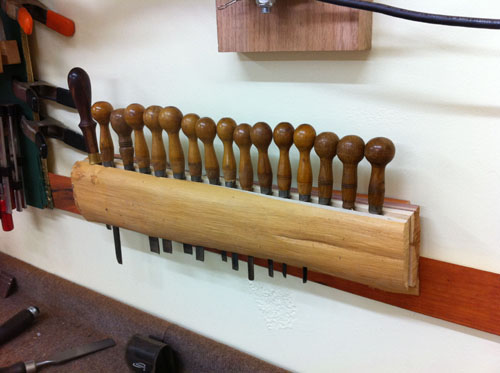 Here's a typical "french cleat hanger", this one made from a cedar post scrap, and used for holding gouges...