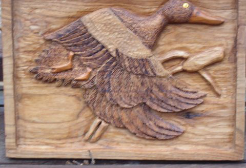This one is a photo of a flying mallard, 8x10, hand carved in butternut, with a danish oil finish.