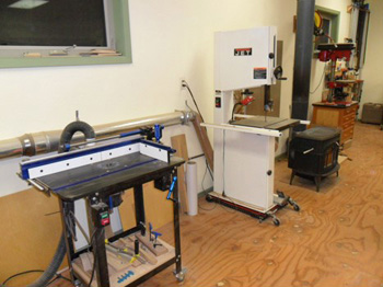 Router table, 17" bandsaw, wood stove, and drill press on top of custom storage cabinet.