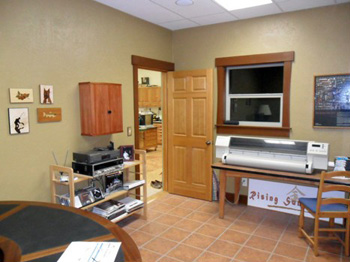 Looking the other way in the office showing a large format printer and the door into the