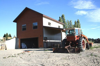The other side of the building showing the daylight garage and shed roofed storage area. This