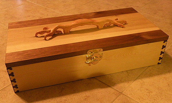 This is a large Feather Box for storing PowWow Feathers (fans used in dancing). It is made with poplar, walnut, pine and maple, with cedar lining to keep feather eating bugs away.