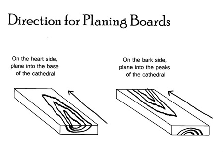 up, orient the board so the bottom or open side of the grain’s cathedral is facing you. Then plane