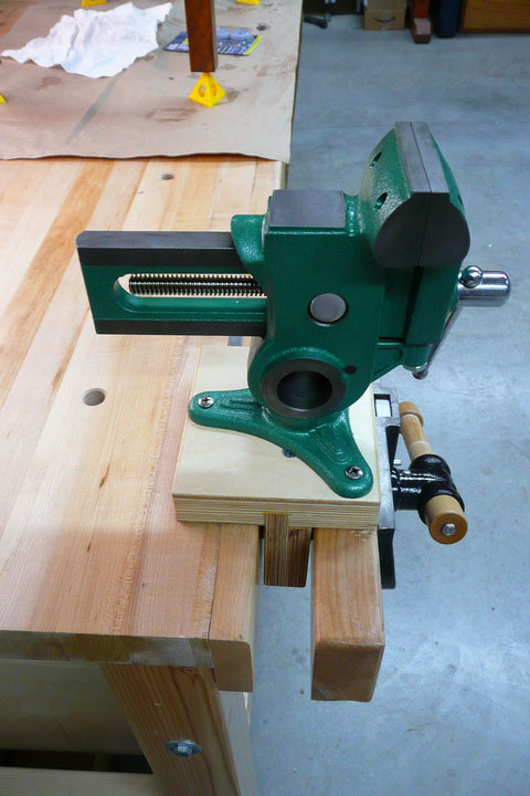 I laminated two pieces of 3/4" plywood, as you suggested, and cut a 1-1/2" dado in the bottom of it to receive a similar lamination--I made a "T" in cross section. The vertical leg is as long as my grandfather’s Wilcox Manufacturing Company woodworking vise can accommodate. The machinist's vise is bolted through the vertical leg at two of its bolt lugs and the third though the "top of the T". Installing and removing the machinist's vise is really fast, and it does not budge when it’s in the Wilcox. This configuration also takes up less shelf space under the bench than a platform-with-clamping-room would.