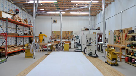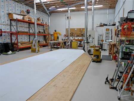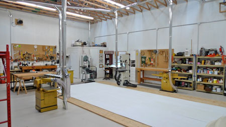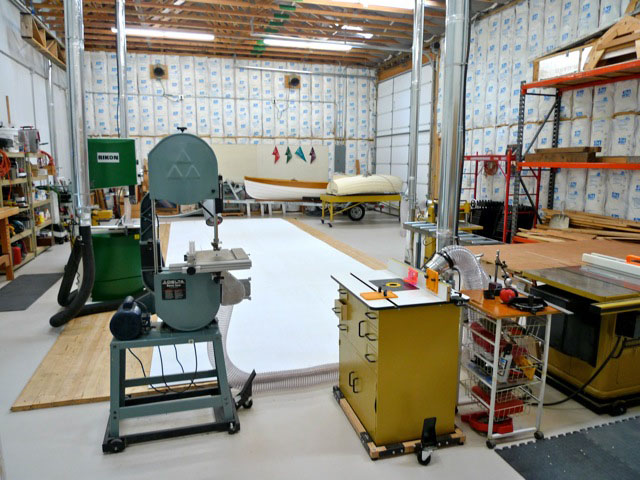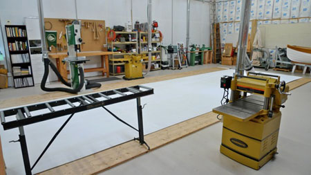 The big white floor is painted plywood temporarily placed over car decking over concrete. The plywood is used to loft (draw out) the boat full size in order to make patterns. The jointer, planer and primary band saw are set mid shop so I can run 25' timbers thru. The dimensions of the shop are roughly 32' x 55', with a 16' ceiling height.