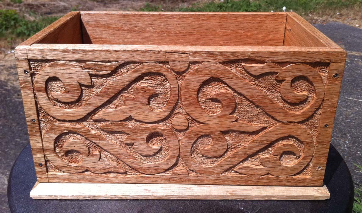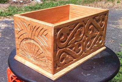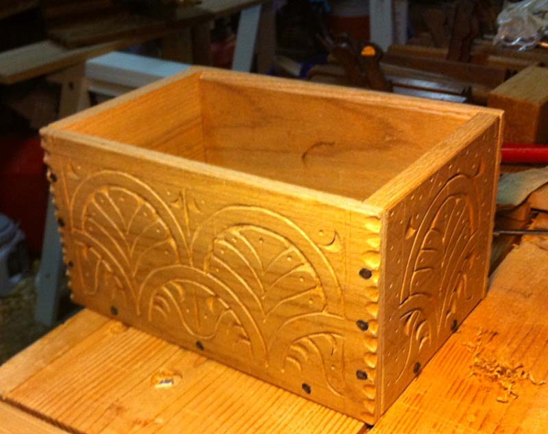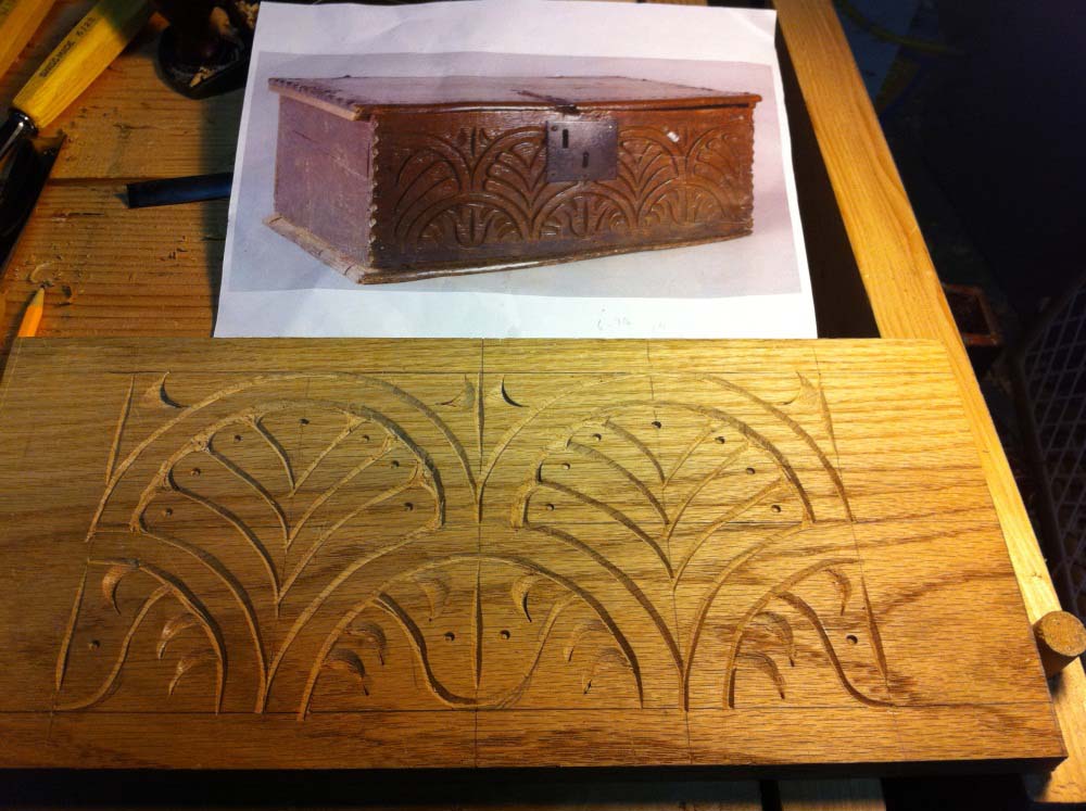 The carving on this toolbox is inspired by a panel on a carved joined chest dated 1676 from a New England carver by the name of Dennis.