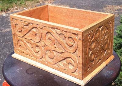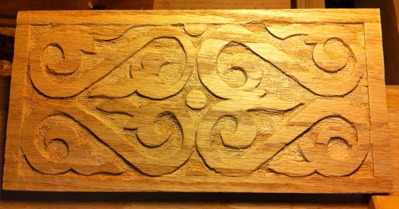I used all hand tools to carve this design, using carving chisels to set in the outline, and relieve the background. The texture on the background is done with shop made punches, and finished with clear shellac. The sides are air dried Alder from the pacific northwest region, and oak and walnut for the ends and handle.