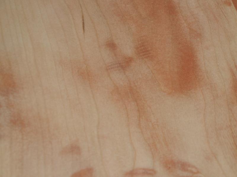 The scratches in the above pictures are obvious but the broad area of dye indicates a depression in the wood that would be very hard to feel or see in a low level light. After continued sanding, there are only a few defects left...but they are still obvious.