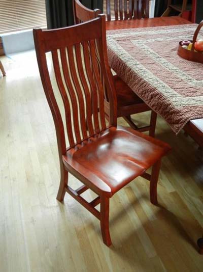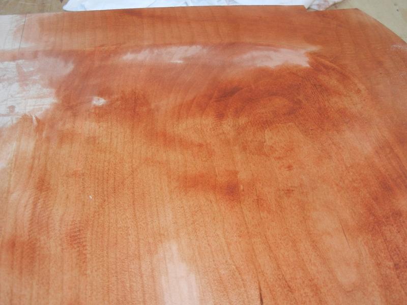 Now, I am starting to apply a trace coat. Since I’m going to eventually dye the chairs a cherry color I’m using a very diluted version of the dye as a trace coat. I could use a light color like yellow but since the cherry is a close grain wood I do not have to worry too much about it penetrating into an open grain. If this was a wood like ash or oak, I would want to stay away from a dark color that may go too deep into the open grain and be hard to sand away. I want to color the surface but not penetrate too deeply into the wood surface.