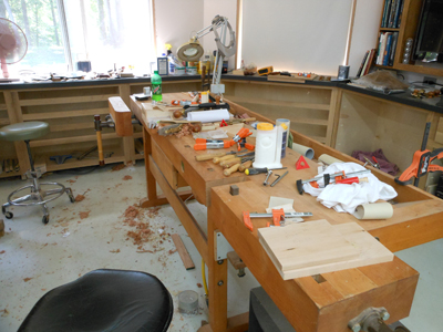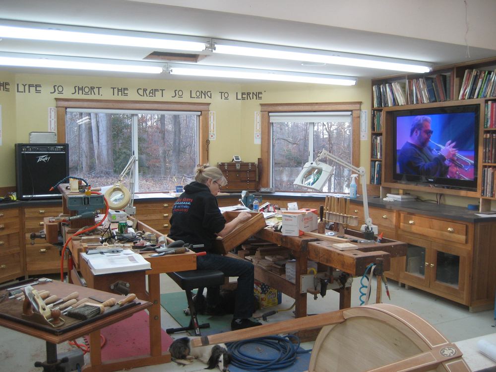 Bench area with Angie working. The Eagles are rocking on the screen and the federal game table with the bellflowers not yet inlaid is visible in the front. The wrap around cabinets are now complete.