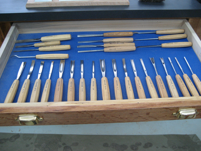 Angie's carving chisels stored in the newly completed cabinets in the bench area.